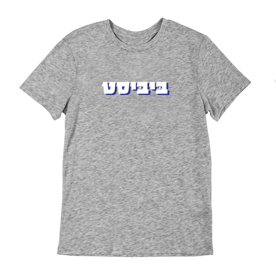 הדפס צבעוני (כחול-לבן) על חולצה בצבע שחור / אפור.